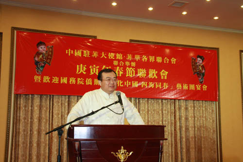 當(dāng)天晚上,中國駐菲律賓大使館和菲華各界聯(lián)合會舉辦盛大的聯(lián)歡晚宴,歡迎藝術(shù)團(tuán)的到來。菲華各界聯(lián)合會主席戴宏達(dá)、中國駐菲律賓大使劉建超、藝術(shù)團(tuán)團(tuán)長熊昌良分別發(fā)表熱情洋溢的致辭。在致辭中,戴宏達(dá)主席和劉建超大使對國務(wù)院僑辦組派如此高水準(zhǔn)的藝術(shù)團(tuán)來菲演出表示感謝,各位藝術(shù)家放棄在春節(jié)與家人團(tuán)聚的機(jī)會,千里迢迢赴海外慰問僑胞,用歡快的歌聲和舞蹈為海外僑社增添了喜慶的春節(jié)氣氛。全體旅菲僑胞將翹首期盼藝術(shù)團(tuán)的演出取得圓滿成功。