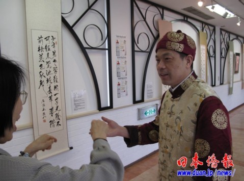 這位濃眉大眼的大漢,是湖南岳陽人,眉宇間有一股坦蕩之氣逼人?傋尮P者懷疑是武林中人。就是這位,自2001年來日本傳播指書文化,短短10年間,已是列島上下,上至國家政要,下至普通市民,爭相結(jié)交的人氣者。