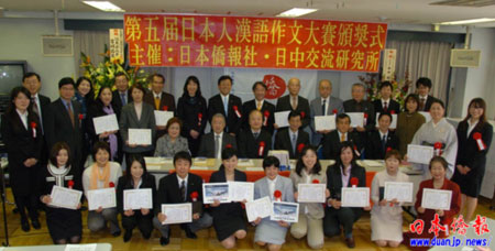 “第五屆日本人漢語作文大賽”共有36名應(yīng)征者獲獎(jiǎng),中國駐日使館許澤友總領(lǐng)事代表程永華大使為川松若菜(學(xué)生組)和佐藤美緒子(社會組)頒發(fā)了“中國大使獎(jiǎng)”。