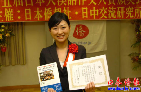 日本麗澤大學(xué)中文系三年級(jí)學(xué)生川松若菜的作文抓住“赴日中國(guó)游客激增”這一現(xiàn)實(shí),以“致訪問(wèn)日本的中國(guó)旅行者”為題,給中國(guó)游客提出了溫馨的提示和建議,獲得中國(guó)駐日使館程永華大使簽署的“中國(guó)大使獎(jiǎng)”。