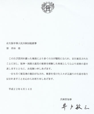 兵庫(kù)縣知事井戶敏三在慰問(wèn)電中說(shuō):“獲悉貴國(guó)發(fā)生了不幸的地震導(dǎo)致很多人民犧牲,作為有經(jīng)歷過(guò)阪神淡路大震災(zāi)的地區(qū)兵庫(kù)縣,我們對(duì)受災(zāi)者表示由衷的哀悼和深刻的慰問(wèn)。我們祈禱災(zāi)區(qū)早日恢復(fù)正常,從心里祝愿地震受害者早日康復(fù)!