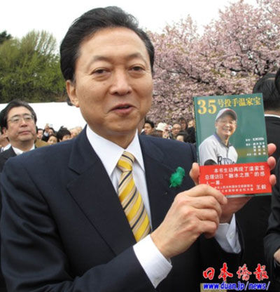 在“賞櫻會(huì)”上,受邀參加的日本僑報(bào)社張景子社長(zhǎng)向鳩山首相贈(zèng)送了該社出版的《35號(hào)投手溫家寶》,鳩山首相欣然收下,并勉勵(lì)日本僑報(bào)社繼續(xù)為日中交流做貢獻(xiàn)。張景子說(shuō),“我們來(lái)自中國(guó),在日本創(chuàng)辦的日本僑報(bào)出版社致力于日中交流,已經(jīng)出版了200來(lái)本書。2008年出版了中日文版《35號(hào)投手溫家寶》,今天特地給您帶來(lái)了一本。”鳩山首相高興地從張景子手中接過(guò)《35號(hào)投手溫家寶》一書,仔細(xì)端詳,并說(shuō):“我下個(gè)月就要與溫家寶總理會(huì)面。希望你們繼續(xù)努力,為促進(jìn)日中交流作出更大的貢獻(xiàn)!闭f(shuō)完,鳩山首相高高地舉起《35號(hào)投手溫家寶》一書,讓大家拍照。