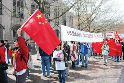 一些示威者認為,達賴是最近西藏暴亂的黑手,目的在反對中國50多年的統(tǒng)治。有些標語寫著“達賴是騙子及美國中情局資助的好戰(zhàn)分子”。很多示威者不斷揮舞巨型中國國旗。