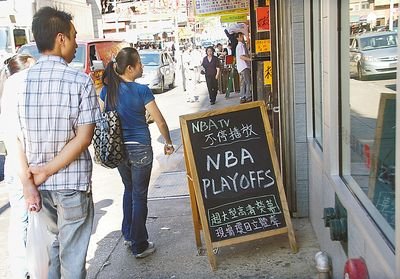 紐約曼哈頓華埠及附近小意大利區(qū)的餐飲業(yè)者也以觀賞體育比賽為噱頭吸引球迷用餐。在華埠有數(shù)間店的“香港站”中餐廳,近日就在地威臣街店面門(mén)前擺放醒目的雙面告示板。一面寫(xiě)著以超大型高清屏幕和現(xiàn)場(chǎng)環(huán)繞立體聲不停播放NBA季后賽,另一面寫(xiě)著從6月11日起至7月11日直播南非世界杯每場(chǎng)賽事。