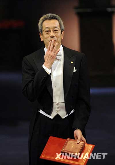 美籍華裔科學(xué)家錢永健領(lǐng)獎(jiǎng)后飛吻慶祝。(新華社)