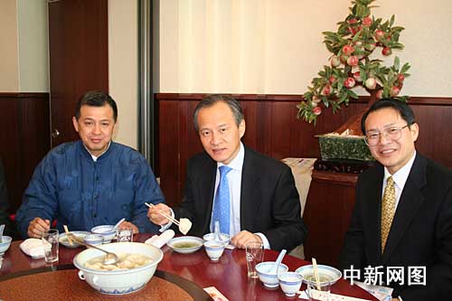 崔天凱大使接著來到中華街上的老字號東榮酒家,和神戶華僑總會會長鮑悅初、株式會社東榮商行代表王銳輝等當?shù)厝A僑代表一邊吃餃子一邊交談,了解餃子事件的各種負面影響。