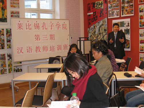 本期培訓(xùn)班的主講是萊比錫孔子學(xué)院對外漢語教師高永安。他結(jié)合德語、漢語的語音比較,講述了對德漢語教學(xué)中的語音教學(xué)技巧;結(jié)合漢語的詞匯特點,講述了詞匯教學(xué)的主要方法,并重點介紹了語素教學(xué)法。參加培訓(xùn)的教師們對課堂內(nèi)容很感興趣,他們一邊聽講,一邊提問題,課堂氣氛十分活躍。學(xué)員們還分享了各自在教學(xué)實踐中的經(jīng)驗,探討了教學(xué)中出現(xiàn)的問題,并共同尋求解決的辦法。