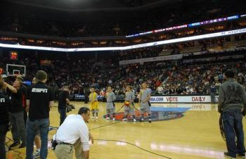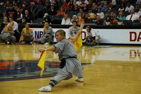 中場(chǎng)休息期間在全場(chǎng)觀眾經(jīng)久不息地助威聲下,費(fèi)佛爾大學(xué)孔子學(xué)院邀請(qǐng)的4位功夫大師由愛美麗·羅德女士率領(lǐng)步入球場(chǎng)中央,功夫大師們恭謹(jǐn)?shù)叵蛉珗?chǎng)觀眾行佛禮。這時(shí)賽場(chǎng)主持人以NBA式的渾厚嗓音向現(xiàn)場(chǎng)觀眾發(fā)布: “讓我們熱烈歡迎今晚的特別嘉賓,費(fèi)佛爾大學(xué)孔子學(xué)院少林功夫大師,他們給我們帶來(lái)了擁有1700年歷史的中國(guó)地道的少林功夫。”
