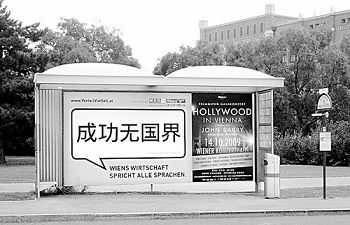 近日,奧地利維也納街頭出現(xiàn)了一些漢字廣告。隨著中國國際影響的增加,奧地利人對(duì)中國的關(guān)注度和對(duì)中國文化的興趣也在不斷上升。維也納大學(xué)漢學(xué)系的學(xué)生從中國改革開放前的約50人激增到現(xiàn)在的約700人;奧地利的漢語教學(xué)機(jī)構(gòu)從維也納大學(xué)漢學(xué)系1家增加到現(xiàn)在的約70家;通過各種方式學(xué)習(xí)漢語的有數(shù)千人。當(dāng)?shù)亟逃块T已在考慮將漢語列入中學(xué)的教學(xué)大綱。正是在這一背景下,漢字廣告牌出現(xiàn)在維也納街頭。圖為10月8日維也納南火車站旁一個(gè)公共車站的廣告牌,上面張貼著維也納商會(huì)的廣告“成功無國界”。(方祥生 攝)