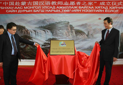 最后,王?蹬c道力鋼共同為“中國(guó)赴蒙古國(guó)漢語(yǔ)教師志愿者之家”揭牌。