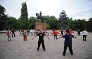 每周二與周五早上八點,武術班都要在比什凱克市內(nèi)街心公園練習一小時,此舉吸引了不少過路人的觀看和參與,成為了一道別具特色的風景線,很受當?shù)孛癖姎g迎。