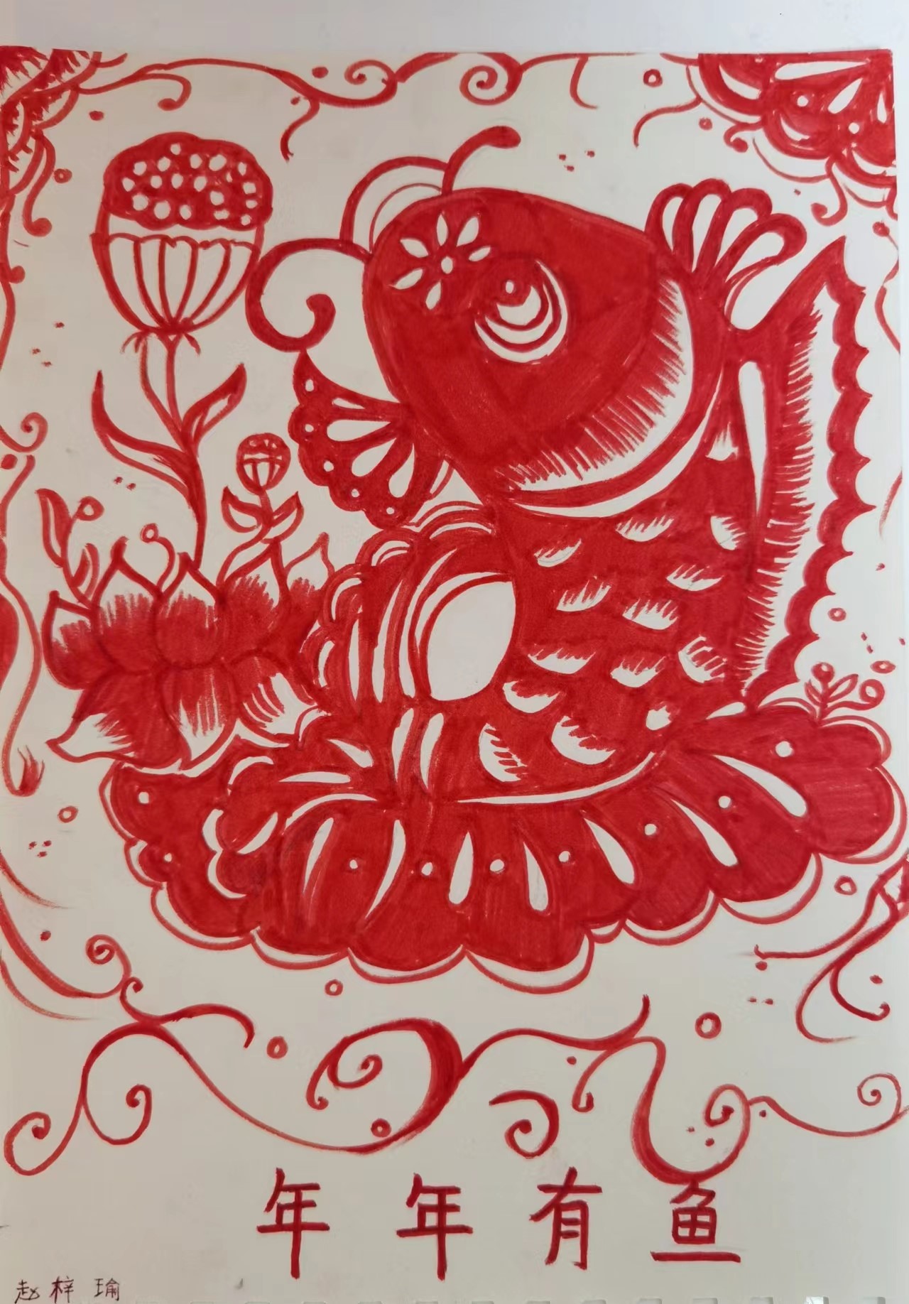 媽媽每年過年時(shí)都會(huì)在窗戶上貼上不同的剪紙窗花。在今年春節(jié)時(shí),我就畫了一幅剪紙風(fēng)格的年畫,這樣我們就可以一直把它掛在墻上,年年有余。