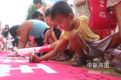 在校長的組織下,沉浸在興奮中的孩子們爭先恐后的來到祝福橫幅前為奧運(yùn)、為中國健兒祝福。在良久思索之后,一個小男孩兒半跪在地上,先用彩筆寫下大大的“加油”兩字,然后又在“加油”下面畫了一個太陽,一間房子、一只小鳥,最后認(rèn)認(rèn)真真的簽上自己的名字:孫衛(wèi)彬。孫衛(wèi)彬說:“太陽代表希望和海爾叔叔阿姨們的關(guān)心,房子是教室,小鳥就是我和同學(xué)們!