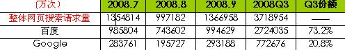 根據(jù)艾瑞咨詢的數(shù)據(jù)顯示,整個2008年第三季度,中國網(wǎng)頁搜索請求量為371.9億次,作為中文搜索領(lǐng)頭羊,百度獨占高達73.2%的市場份額,繼續(xù)牢牢占據(jù)著中國搜索引擎市場的頭把交椅;而排名第二的谷歌的網(wǎng)頁搜索請求市場份額則僅僅為20.8%。