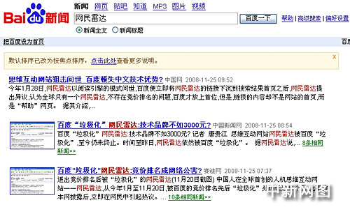 從25日的截圖可以看到,在百度新聞搜索輸入關(guān)鍵詞“網(wǎng)民雷達(dá)”,質(zhì)疑百度“垃圾化”網(wǎng)民雷達(dá)的新聞及媒體轉(zhuǎn)載情況赫然入目,但是,24日的《思維互動(dòng)網(wǎng)站狙擊問世 百度頓失中文技術(shù)優(yōu)勢(shì)?》一文,在谷歌可見至少有新浪、中國(guó)網(wǎng)、和訊、21cn、金融界等多個(gè)網(wǎng)站轉(zhuǎn)載,但在百度卻全被屏蔽。只有25日中國(guó)網(wǎng)刊登的這篇文章得以幸存。