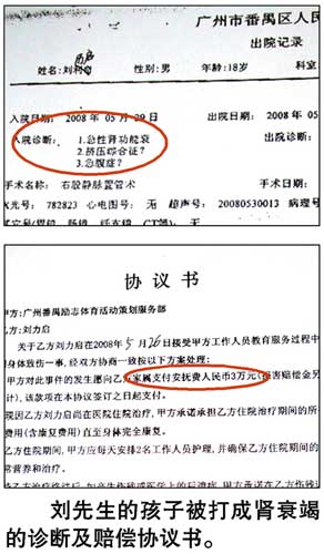 與楊先生同病相憐的還有東莞的劉先生,他的孩子在去年5月26日送進(jìn)一個(gè)訓(xùn)練營(yíng),訓(xùn)練期也是三個(gè)月,繳費(fèi)13100元,而30日孩子便被送進(jìn)醫(yī)院,經(jīng)醫(yī)生診斷為毆打、缺乏飲用水造成的腎衰竭。劉先生說(shuō),訓(xùn)練營(yíng)的訓(xùn)練內(nèi)容“基本上沒有心理輔導(dǎo),只有少得可憐的法制教育,其余的全部都是‘生理輔導(dǎo)’和軍事訓(xùn)練”。