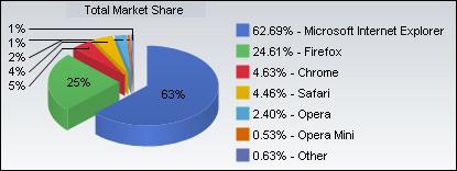 Net Applications數(shù)據(jù)顯示,Chrome當前市場份額為4.63%,而Safari為4.46%。相比之下,微軟IE市場份額仍居主導地位,市場份額為62.69%。