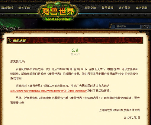 網(wǎng)易昨天是在一篇魔獸世界游戲內(nèi)活動(dòng)的公告中披露上述消息的。公告稱將從2010年2月8日至2月14日,連續(xù)七天舉行《魔獸世界》老玩家新春回饋活動(dòng)。活動(dòng)期間將暫!赌ЙF世界》的新用戶注冊(cè),并向所有注冊(cè)老用戶按照每天3小時(shí)的標(biāo)準(zhǔn)贈(zèng)送游戲時(shí)間。