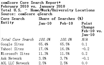 北京時間3月11日消息,據(jù)國外媒體報道,互聯(lián)網(wǎng)調(diào)研公司comScore今天發(fā)布了美國搜索市場月度調(diào)查分析,該分析顯示2010年2月美國核心搜索量145億次,由于二月份天數(shù)較少,環(huán)比下降5%。其中谷歌網(wǎng)站占據(jù)了搜索市場份額的65.5%,必應(yīng)略有上升,而雅虎則繼續(xù)下滑。值得關(guān)注的是,來自Facebook的搜索請求大增10%,在其他主要網(wǎng)站的總搜索請求均有所下降的背景下,這一業(yè)績十分突出。
