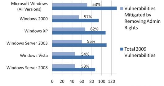 報(bào)告稱,取消Windows 7管理員權(quán)限,去年發(fā)現(xiàn)的全部Office漏洞都可以被避免,94%的IE漏洞可以避免,100%的IE 8漏洞可以避免,64%的所有微軟產(chǎn)品漏洞可以避免。