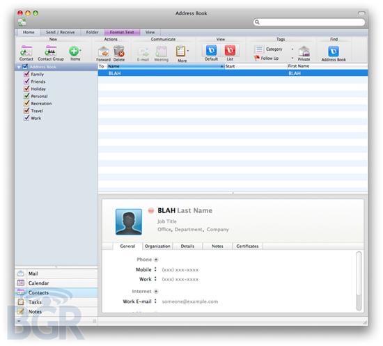 與微軟Office 2010的外觀非常相似,Office 2011 for Mac在一個應(yīng)用程序上都包括這個絲帶。這是微軟首次在用于Mac機(jī)的Office套裝軟件中提供Outlook程序。用于Windows和Mac機(jī)的Outlook軟件的外觀是一樣的,包括郵件預(yù)覽框、日歷、聯(lián)絡(luò)人、任務(wù)和備注等。