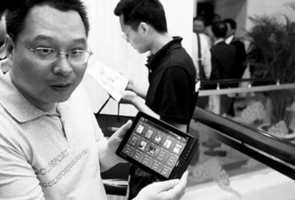 圖為消費者展示手中的國產(chǎn)平板電腦。盡管沒有鍵盤,但平板電腦依然具有筆記本電腦的各種功能。 本報記者 陳 靜攝
