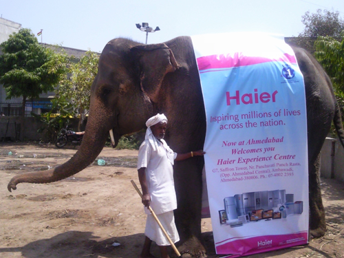中新網(wǎng)4月8日電 在印度,大象是吉祥之物。日前,在印度著名的旅游城市艾哈邁達(dá)巴德的街頭,一頭背上馱著海爾宣傳畫的大象,氣宇軒昂地穿梭在繁華的街市,為新開業(yè)的海爾體驗(yàn)店助威宣傳。這種宣傳方式別出心裁,吸引了很多印度消費(fèi)者來到海爾體驗(yàn)店體驗(yàn)海爾全系列高端差異化產(chǎn)品。