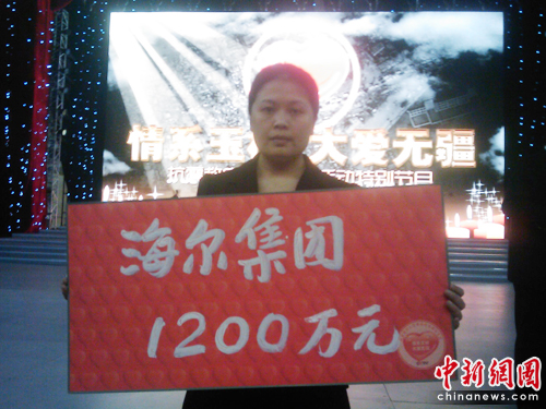中新網(wǎng)4月21日電 4月20日,由中宣部、國家廣電總局、民政部、中國紅十字會主辦,中央電視臺承辦的《情系玉樹 大愛無疆--抗震救災(zāi)大型募捐活動特別節(jié)目》在中央電視臺現(xiàn)場直播。海爾集團(tuán)在現(xiàn)場向?yàn)?zāi)區(qū)捐款1200萬元,全力支持災(zāi)區(qū)緊急救災(zāi)和災(zāi)后重建工作。
