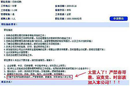 8月31日,網(wǎng)友“湘水悠悠”在爆料說,他在求職網(wǎng)上看到一個超級雷人公司招聘啟事,職位要求里面竟然有莫名其妙的規(guī)定:不屬于任何網(wǎng)絡教派,嚴禁春哥教、寂寞黨、時彩族加入本公司。
