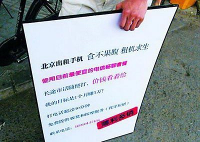 記者在論壇上看到,發(fā)帖的網(wǎng)友表示參照之前“強(qiáng)人”給她整理的手機(jī)賺錢指南,花費(fèi)50元做了兩塊廣告牌便和妹妹一起出租手機(jī)開始創(chuàng)業(yè)。論壇帖子中還附帶了網(wǎng)友舉著廣告牌在北京的地鐵站做宣傳的圖片。廣告牌上寫著“北京出租收集,食不果腹,租機(jī)求生,使用目前最優(yōu)惠的套餐,長(zhǎng)途市話隨便打,價(jià)錢看著給,我的目標(biāo)是1個(gè)月賺5萬(wàn)!打電話超過(guò)30分鐘,免費(fèi)提供板凳和按摩服務(wù)(我穿短裙)”。該名網(wǎng)友稱,“目前成本已經(jīng)掙回,滾滾大洋正在朝我們奔騰而來(lái),大家還有什么高招趕快說(shuō)”。昨日,記者曾嘗試撥打廣告牌上的聯(lián)系方式與該網(wǎng)友聯(lián)系,但被告知為空號(hào)。