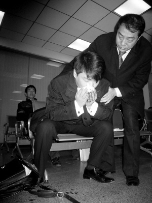黃靜的代理人周成宇和代理律師付占平一起來到朝陽法院,向法院遞交向華碩討名譽(yù)權(quán)索賠100萬的立案申請,在排號(hào)機(jī)上取號(hào)后,周成宇與律師進(jìn)入受理大廳等候。就在眾人等待之時(shí),剛才還在與律師交談的周成宇突然口噴鮮血,令大廳內(nèi)的人吃驚不已。有記者遞給周成宇紙巾,擦拭嘴上的血跡,在律師的攙扶下,周成宇坐下,幾次又出現(xiàn)嘔血的狀況。雖然他一直稱沒事,拒絕叫急救車,但臉色蒼白,拿著紙巾的手也不住地顫抖。