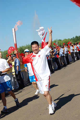 第三棒火炬手飛鶴乳業(yè)董事長(zhǎng)冷友斌手持火炬