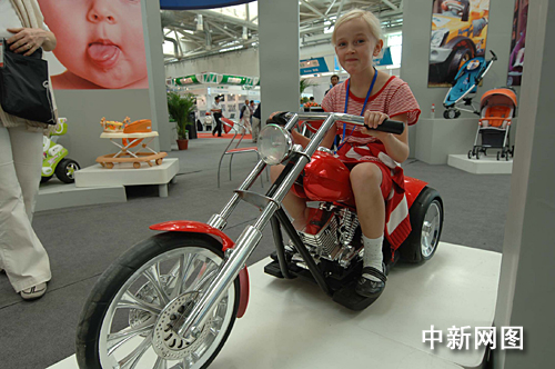 展覽會上,一個外國孩子騎著中國發(fā)明制造的玩具電動車。(鄒憲 攝)