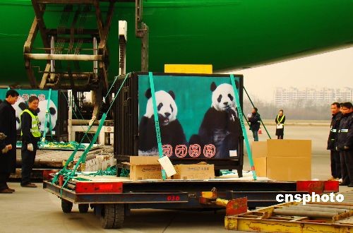 12月23日13時40分,成都雙流國際機場,工作人員正將贈臺大熊貓“團團”“圓圓”運上臺灣長榮航空公司的載運專機。中新社發(fā) 霍潺 攝