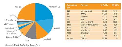 攻擊針對(duì)20800個(gè)獨(dú)立端口,相當(dāng)于第三季度的8倍多。其中,針對(duì)445端口(Microsoft-DS)的攻擊最多,約占來自美國(guó)和俄羅斯的25%