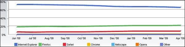 過去12個(gè)月,IE市場(chǎng)份額平均每月下降0.7%。如果按照該趨勢(shì)發(fā)展,2011年5月,IE有望跌破50%。