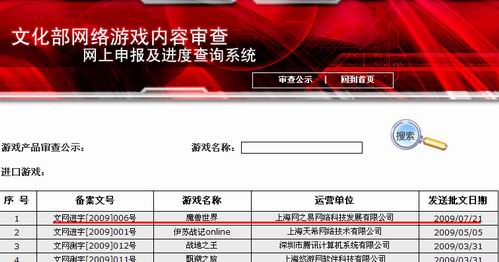 中新網(wǎng)7月21日電 今天,根據(jù)文化部網(wǎng)絡(luò)游戲查詢系統(tǒng)網(wǎng)站()上的信息顯示,由上海網(wǎng)之易網(wǎng)絡(luò)科技發(fā)展有限公司引進(jìn)的網(wǎng)絡(luò)游戲《魔獸世界》正式通過審批,批號(hào)為文網(wǎng)進(jìn)字[2009]006號(hào),批文送發(fā)時(shí)間為2009年7月21日。