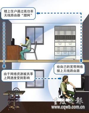 “這簡直與偷盜無異!奔易∈瘶蜾伩茍@一路的劉先生,最近家里的寬帶網(wǎng)絡(luò)總是“堵車”,有時(shí)連上個(gè)QQ都十分吃力,經(jīng)常斷斷續(xù)續(xù)。后來找人一看,原來是家里用的無線路由器,被樓上新搬來的租賃戶用筆記本電腦“順手牽羊”連上去了。