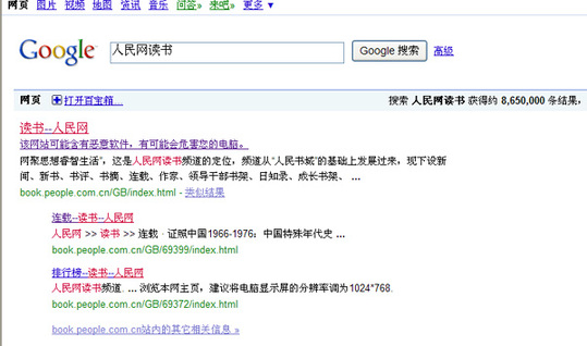 這兩天,你如果通過谷歌檢索“人民網(wǎng)讀書頻道”,檢索結(jié)果里會發(fā)現(xiàn)這樣的提示:“該網(wǎng)站可能含有惡意軟件,有可能會危害您的電腦!