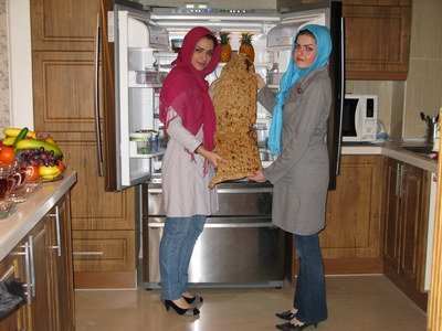 然而,直徑足有60厘米、比臉盆還大一圈的大馕餅在存儲時卻一直困擾著伊朗人。因為出鍋時間一長,馕餅就干得像石頭一樣堅硬,所以當?shù)厝司拖氲接盟芰洗饋矸胚M冰箱里保存,這樣吃的時候還會柔軟猶如剛出鍋。但這樣又誕生了新的問題,因為傳統(tǒng)冰箱空間局限,巨大的馕餅只能切割成小塊再保存,這樣又會影響到馕餅醇厚彌久的口感。