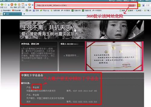 中新網(wǎng)4月24日電 360安全中心今日再度發(fā)出釣魚網(wǎng)站安全警示:近期不法分子以玉樹賑災捐款的名義制作了大量釣魚網(wǎng)站,利用網(wǎng)友愛心大肆詐騙。360安全專家石曉虹博士為此提醒廣大網(wǎng)民,在網(wǎng)上用網(wǎng)銀、第三方支付工具等在線方式捐款一定要慎重,并盡量使用360網(wǎng)盾等有效的反釣魚軟件進行自動識別各種釣魚網(wǎng)站。