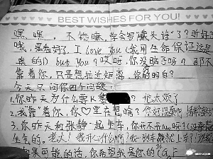 中學生,甚至是小學生的“早戀”已不是什么值得大驚小怪的事情了,然而在看了網(wǎng)友“typhooncome”于日前發(fā)出的“雷死人的六年級小學生的字條”一帖中,幾張兩個六年級小學生互相“傳遞愛語”的字條后,記者還是著實被雷了一把,其中的內(nèi)容和用詞就如發(fā)帖者所說的一樣“非常非常雷人”。