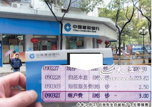 2006年4月,張先生向建行南昌洪都支行申請了房貸。銀行為他單開了一個專門用于還房貸的賬戶。張先生說,該賬戶自使用起,每隔3個月會被扣掉3元的賬戶管理費,但直到今年2月,和朋友聊天才得知所謂的賬戶管理費實為小額賬戶管理費。