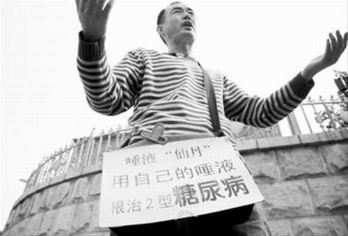 “唾液‘仙丹’”、“用自己的唾液”、“根治2型糖尿病”,連日來,一名30歲左右的男子,背著一個(gè)貼有“根治糖尿病”字樣的挎包,在人民廣場(chǎng)徘徊。他自稱推廣糖尿病的新療法,卻不愿詳述治療原理,在眾人面前做廣告,又不愿透露自己的身份。