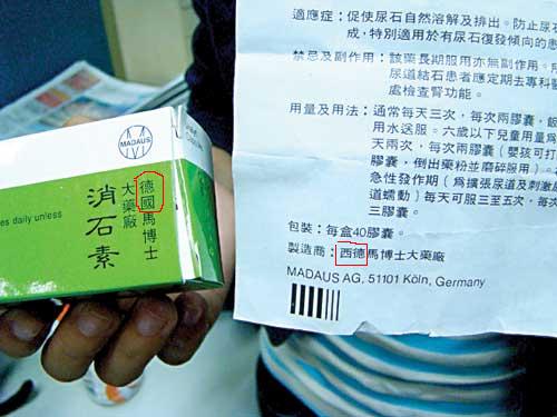 17日上午,記者看到“消石素”的藥盒上寫有“德國(guó)馬博士大藥廠”字樣,而說明書上標(biāo)的制造商,卻是“西德馬博士大藥廠”。就是“德國(guó)”與“西德”這點(diǎn)差別,讓李先生對(duì)藥品的真實(shí)性產(chǎn)生了懷疑。李先生認(rèn)為,東德與西德早就統(tǒng)一,哪里既有德國(guó),又有西德呢?