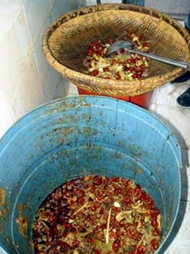 昨日下午,記者以顧客的身份來(lái)到該火鍋店,無(wú)意中在洗刷間看到,里面排放著2只一大一小臟兮兮的潲水桶。記者走近一看,發(fā)現(xiàn)大桶里有很多剩菜,包括暗紅的辣椒、蔬菜、鴨血、餐巾紙、煙頭、筷子等各種雜物。旁邊的一個(gè)小桶上擱著一個(gè)竹筐和一把勺,筐中已經(jīng)盛了許多辣椒和大蒜等剩菜。記者詢問(wèn)一名進(jìn)來(lái)端盤子的服務(wù)員,撈起這些剩菜做什么用途時(shí),對(duì)方稱老板規(guī)定,客人吃剩的菜不能隨便倒,還可以用。但該服務(wù)員很快就意識(shí)到說(shuō)漏了嘴,立即問(wèn)記者進(jìn)洗刷間做什么。記者再問(wèn),對(duì)方三緘其口。