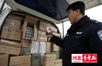 “他們稱自己是快郵公司的,幫一位貨主往石家莊郵局送貨!泵窬顕暾f,他們檢查發(fā)現(xiàn),該車?yán)氖羌耐珖鞯刂委燂L(fēng)濕、關(guān)節(jié)炎、定喘等癥狀的保健藥品。通過直觀判斷,這些藥瓶質(zhì)地粗糙,疑似假藥,兩民警立即將情況上報大隊長張紅慶。