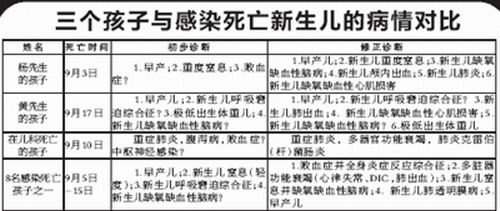 家屬們認(rèn)為,兩位孩子死亡癥狀與公布的8名死亡患兒驚人地相似(見(jiàn)左表),醫(yī)院感染問(wèn)題應(yīng)該不只是這11天,以這么具體的時(shí)間劃分孩子的死因,顯然違背科學(xué)精神。