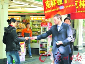 昨日,一位名叫“克林頓”的人在東莞街頭給消費(fèi)者免費(fèi)派發(fā)其代言的安全套(見上圖)。不過,這位“克林頓”可不是前美國(guó)總統(tǒng)比爾·克林頓,而叫威廉·比利·克林頓,加拿大人。對(duì)于商家的宣傳手法,有市民質(zhì)疑這是借美國(guó)前總統(tǒng)克林頓的名字來制造噱頭。(記者 周偉涵 通訊員 黃菲 攝)