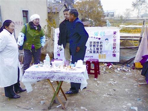 7日,記者現(xiàn)場看到,一個用白桌布鋪好的小桌上擺著牙具模型、補牙、脫脂棉、酒精等治牙工具,兩個破舊的牙具模型上黑色污垢清晰可見,所有工具包括酒精均只看到膠布貼的標識,旁邊是兩把塑料椅,3只杯子,四五瓶藥和六七把拔鉗。大幅宣傳畫靠在路邊的垃圾堆上,一名老人剛看完牙正遞給“牙醫(yī)”10元錢。
